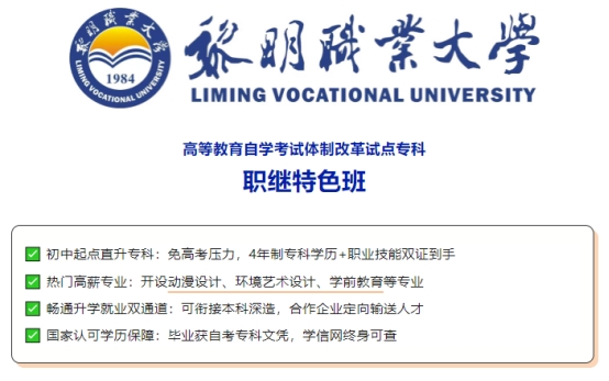 中考分数不够上普高,又不想读中专、技校的学生可以选择黎明职业大学高等教育自学考试体制改革试点专科职继特色班。