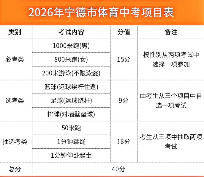 2026宁德市体育中考抽选考项目为:1分钟跳绳、1分钟仰卧起坐、50米跑