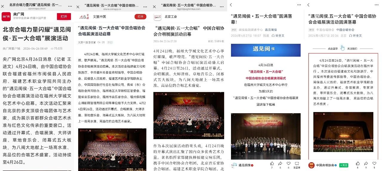 这场以“山海和鸣致敬长征精神”为内核的艺术盛会,通过开幕式演出、合唱展演、大师讲座、草地音乐会、闭幕式五大板块,献上了一场兼具思想高度与艺术温度的合唱盛宴,吸引了央广网、文旅中国、福州日报等中央、省、市级媒体的关注及报道,也为学校师生搭建了与国家级艺术团队同台切磋的实践平台。