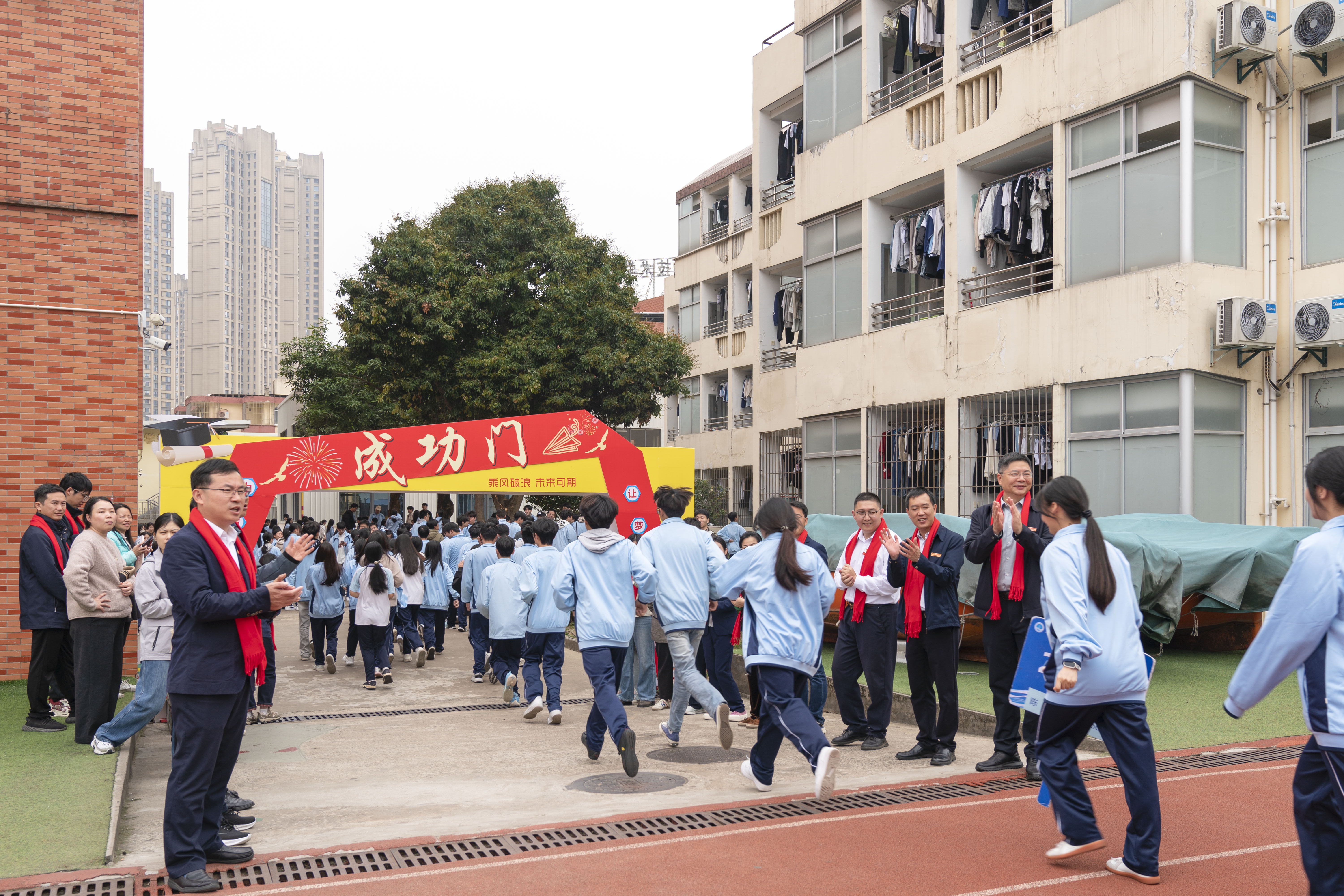 策马扬鞭,师长立门伴学考。动员大会最后,校党委书记张友权率校领导班子与老师们伫立在“学考成功门”两侧,为同学们送上仪式感满满的真挚祝福。全体考生整齐列队,依次迈过成功门,以昂扬的姿态奔赴青春考场,寓意着冲破阻碍、迈向成功。