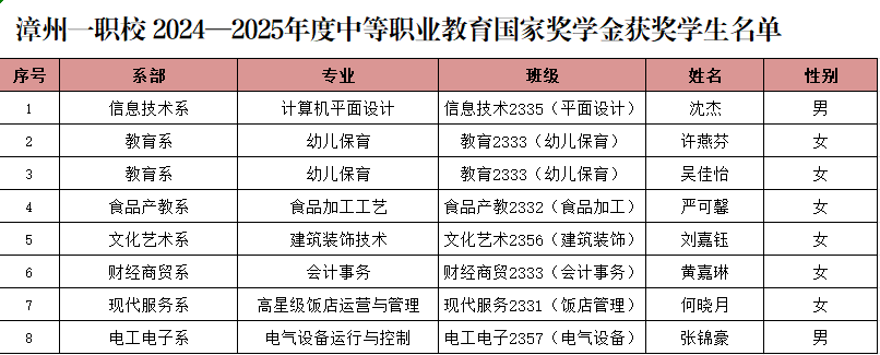 国奖荣光耀一职 榜样引领争创优——漳州第一职业中专学校8名学子荣膺2024-2025年度国家奖学金