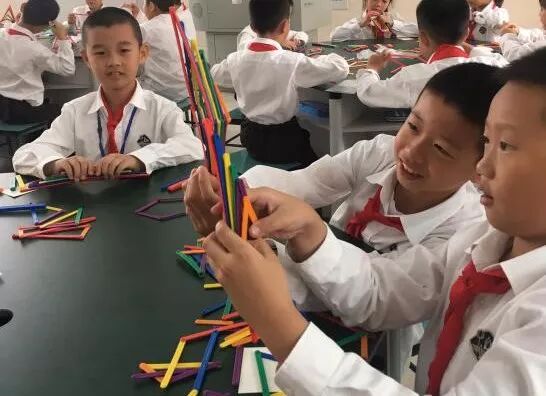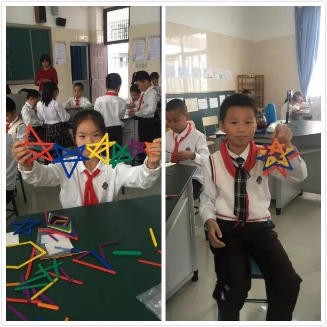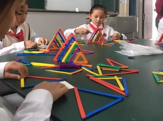 ▲玩中学,学中玩。在操作的过程中,学生直观地了解到了很多数学知识,“三角形很稳定”、“四边形不稳定”、“三角形的种类”……