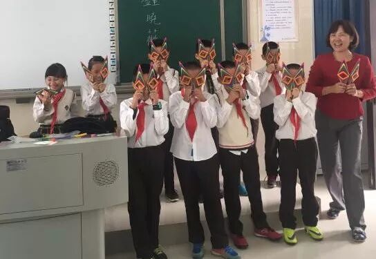 ▲和蔼可亲的钟晓薇老师与学生互动。(由几个菱形组成的面具)
