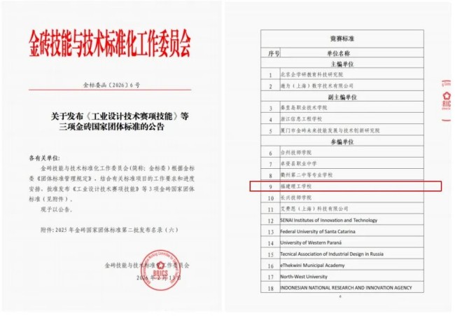 近日,金砖技能与技术标准化工作委员会发布《工业设计技术赛项技能》等3项金砖国家团体标准的公告,该标准于2026年3月13日正式实施。福建理工学校谭静、王虞锦两位教师受邀参与工业设计技术赛项竞赛标准的起草编写工作,我校也成为该金砖国家团体标准的重要参编单位,专业实力与行业贡献再度获国际专家组高度认可。此次参编国际标准,是我校继增材制造赛项金砖国家团体标准后,在职业教育国际化标准建设领域取得的又一重要成果,充分彰显了我校教学创新团队强劲的创新活力、过硬的专业能力与卓越的行业服务水平。