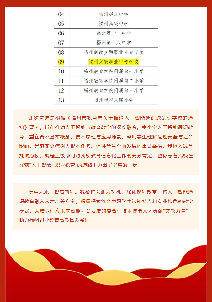 喜报 | 福州文教职业中专学校入选福州市首批“人工智能通识课试点学校”