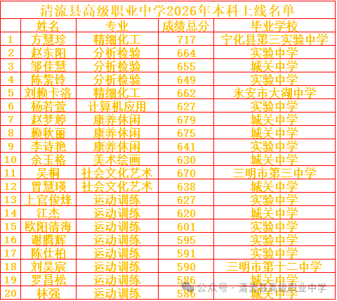 2026年福建省中等职业学校学业水平考试成绩公布,清流县高级职业中学全体师生深耕职教、笃行实干,在本次考试中取得可喜成绩,20名学子本科上线,专科高分段上线率 100%,学校各专业均有学子圆梦本科,实现了各专业升学发展的全面突破、多点开花。