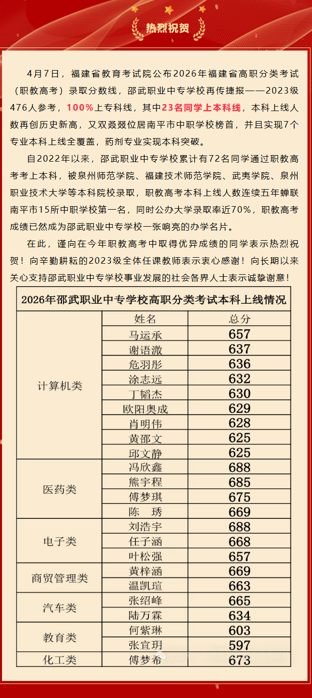 23人本科上线 蝉联南平五连冠——2026年邵武职业中专职教高考再创新高