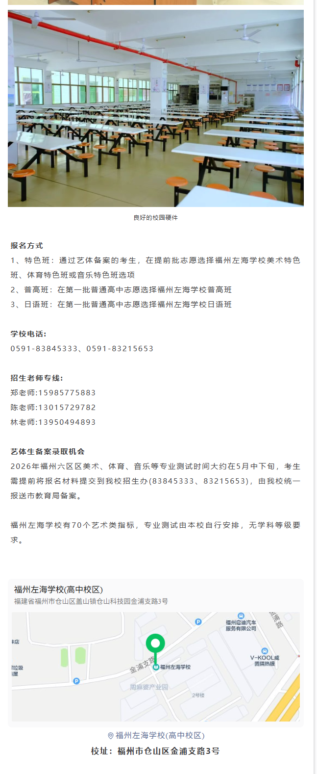 福州左海学校创办于1993年,是市属15年一贯制民办学校,现有幼儿园、小学、初中、高中在校生3000余人,幼小初校区位于仓山区金阵路1号,高中校区位于仓山区金浦支路3号。