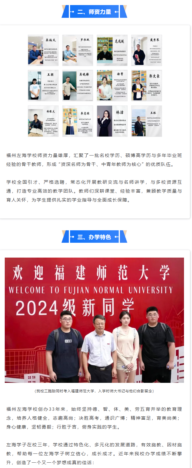 学校秉持“爱的教育,铁的纪律”校训。秉持人人成才的教育理念,紧扣新课标新高考精神,坚持文化强校,五育并举。学校在不断深化教育改革,对标高考素养和学生长远发展的总要求下,构建“大语文”“艺体”“日语”三大左海特色教育,通过多元育人,助力学生赢在高考,胜在未来。