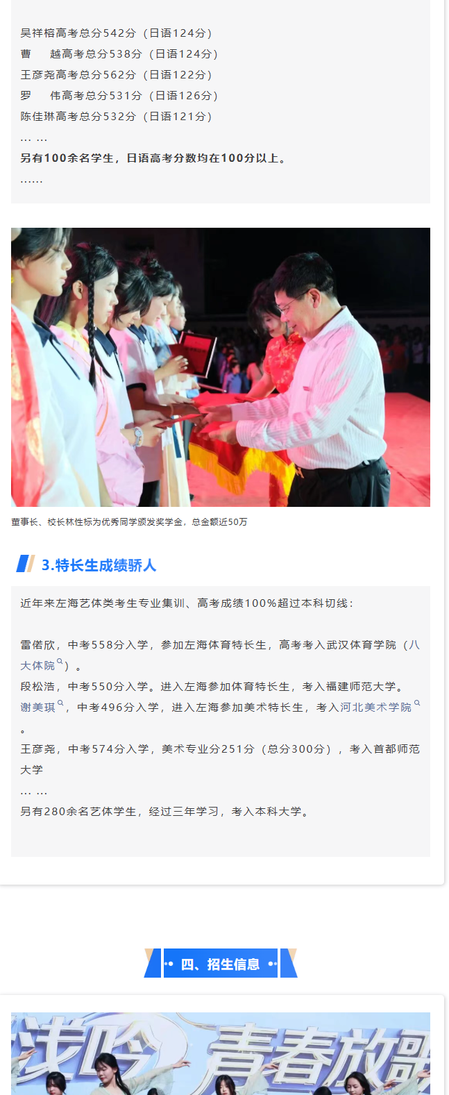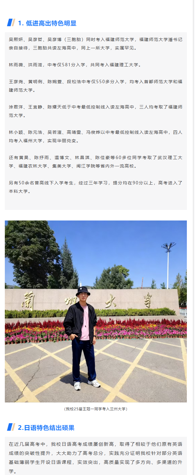 近年来,我校“特色鲜明,成绩卓越”“低进高出,高进优出”的办学实效越来越得到社会各界广泛认可,学生以较低的中学入口成绩考取浙江大学、武汉大学、四川大学、厦门大学、福建师范大学、上海财经大学、中央美术学院、四川音乐学院等众多知名高校。践行印证了左海不负学生,不负家长的铮铮诺言。
