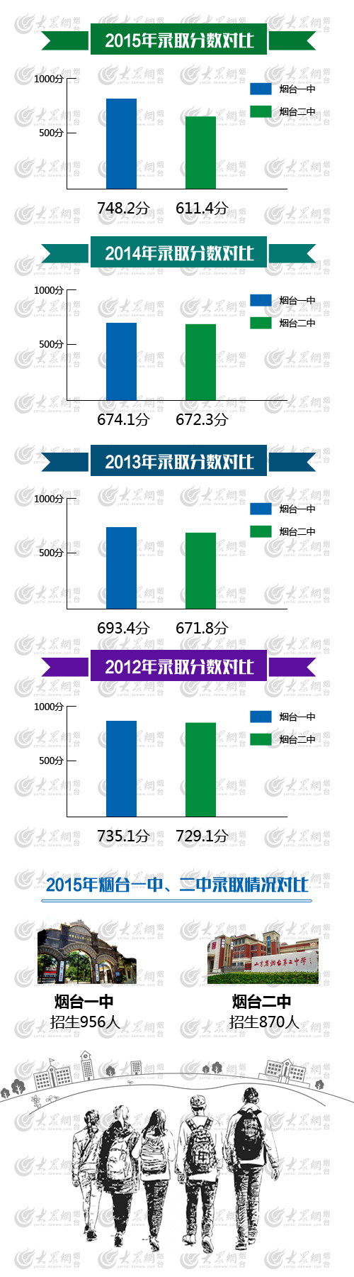 近日,烟台市教育部门公布了2015年芝罘区、莱山区普通高中录取分数线。其中烟台一中748.2分,烟台二中在芝罘区的分数线为611.4分。两所在烟台原本旗鼓相当的中学,今年在芝罘区的录取分数线竟然相差了130多分,让很多学生、家长和教育工作者大跌眼镜。