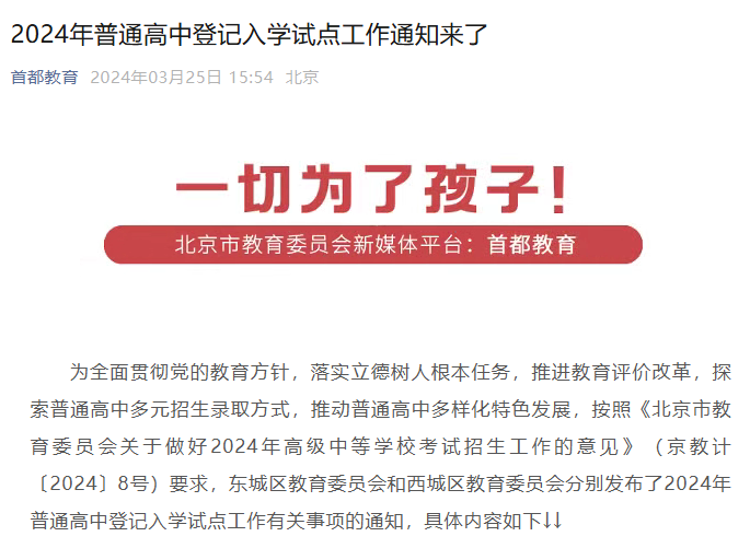 去年,北京市教育委员会就在东城区和西城区分别开展了普通高中登记入学试点工作。登记入学依据北京市初中学生综合素质评价材料开展录取工作。