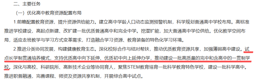 10月20日,上海市教育委员会在官网发布了《上海市普通高中高质量发展实施方案》。其主要任务之一“优化高中教育资源配置布局”细则中, 提及“试点长学制贯通培养模式,支持优质高中向下延伸,优质初中向上延伸办学,推动建设一批高质量的完中和含高中一贯制学校”。