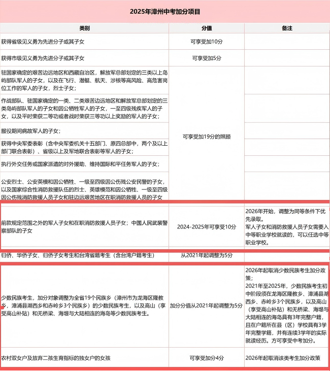 一是“户籍在我市的无桥梁、海堤与大陆相连的海岛少数民族考生”2021年—2025年可加3分,于2026年取消。
