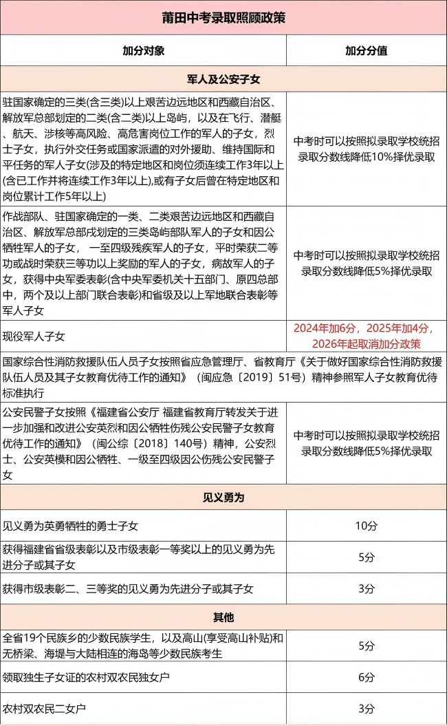 现役军人子女。在莆田就学的驻莆现役军人子女,中考加分政策调整为:2021年加12分,2022年加10分,2023年加8分,2024年加6分,2025年加4分,2026年起取消加分政策。